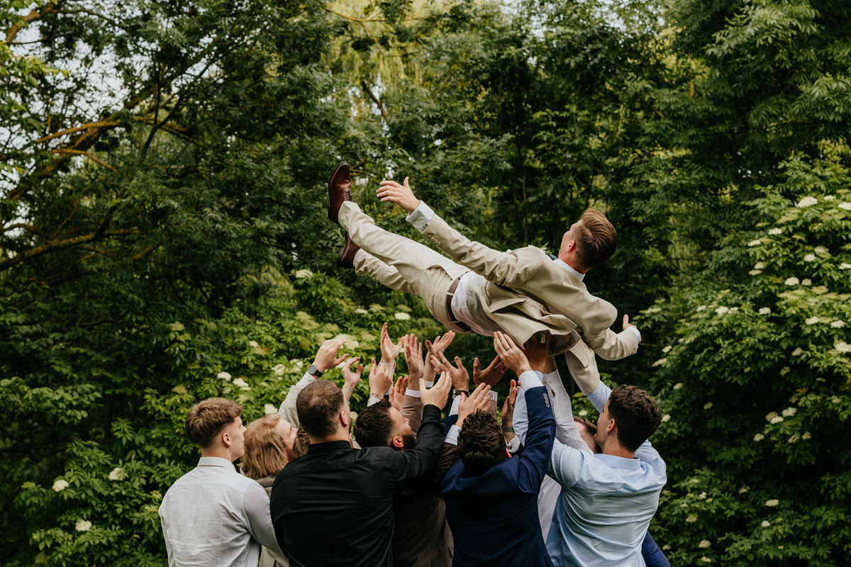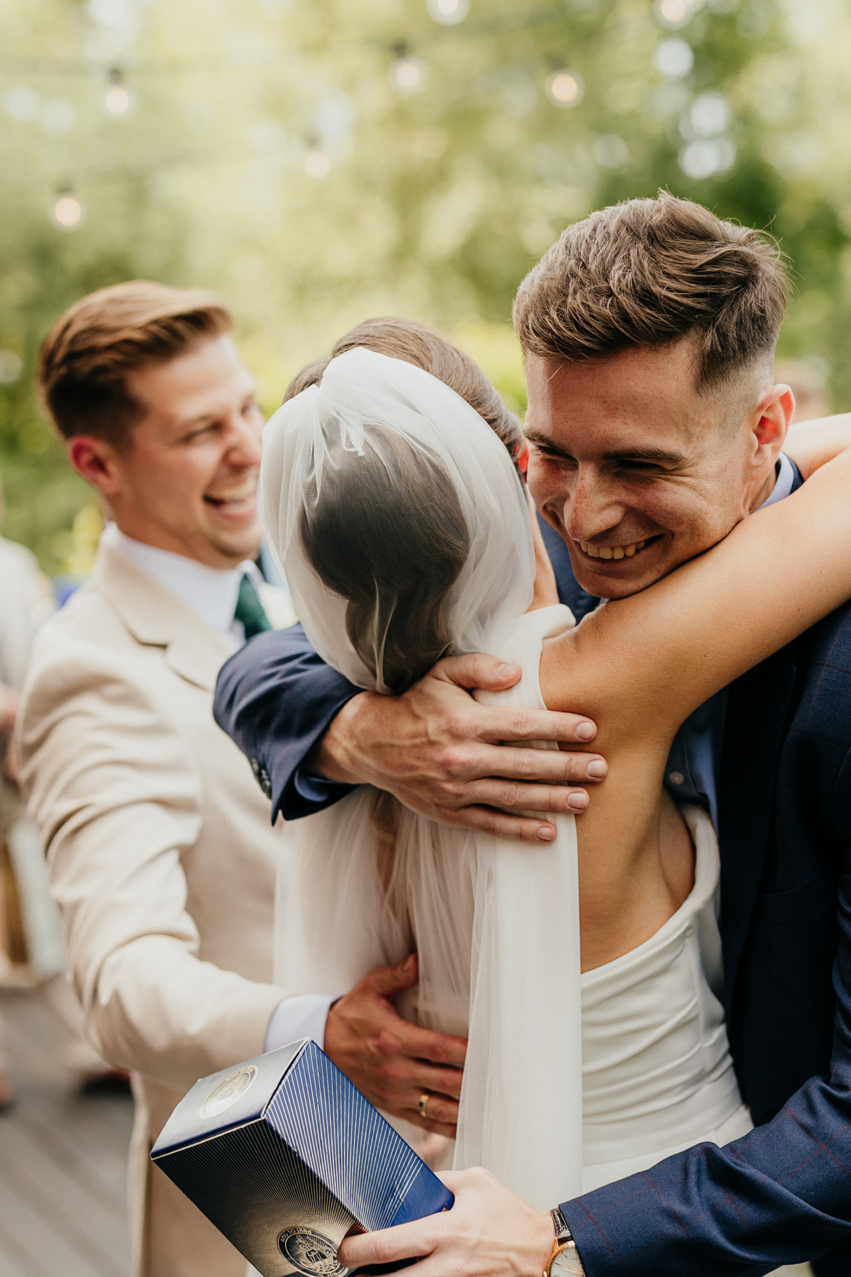 Przygotowania zorganizowaliśmy w domku blisko sali, co dało nam swobodę, dużo przestrzeni i dodatkowy czas na zdjęcia. Bardzo polecamy przygotowania na zewnątrz! Jest to zdecydowanie wygodniejsze. Warto też przygotować jakieś „rekwizyty” typu szampan czy muzykę, dla rozluźnienia atmosfery. I nie martwcie się, że szykując się w jednym miejscu, zobaczycie się za szybko. Już my nad tym czuwamy, abyście zobaczyli się dopiero podczas first looku ;)